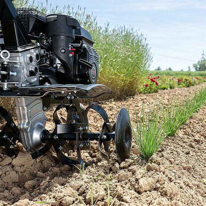 Variabel in der Bedienung – die AL-KO Benzin-Motorhacke MH 770 Comfort – Die Motorhacke MH 770 Comfort ist Ihr robuster Helfer für den effizienten, zeitsparenden Einsatz ihrer zu bearbeitenden Flächen. – Ob zur Kultivierung, Lüftung oder Lockerung des Bodens: Mit der dieser Motorhacke bereiten Sie den Boden vor dem Säen gut vor, lockern ihn auf und arbeiten Nährstoffe, Dünger oder frischen Mutterboden ein. Für besonderen Bedienkomfort sorgt hierbei der ergonomische Führungsholm welcher variabel und werkzeuglos seitlich und in der Höhe verstellt werden kann. Wird der Holm zur Seite verstellt kann die Fläche bequem bearbeitet werden ohne die bereits bearbeitete und somit gelockerte Erde betreten zu müssen. Die Im Lieferumfang bereits beinhalteten Schutzscheiben begrenzen den Arbeitsbereich und gewährleisten somit wirkungsvolle Schutz von bereits bestehenden Anpflanzungen. – Mehrfachnutzen – kein Problem – An diese Motorhacke können gleich mehrere Zubehörteile angebaut werden, wie z.B. ein Häufel- oder Kartoffelpflug oder Beetpflug. Zur besseren Traktion empfiehlt es sich beim Verwenden von Pflügen den ebenfalls angebotenen Stahlradsatz anzubauen. – Die Motorhacke MH 770 Comfort unterstützt Sie kraftvoll bei der Bearbeitung größerer Flächen. Durch zwei Vorwärtsgänge können sie die Arbeitsgeschwindigkeit sowie das Hackergebnis bequem an Ihre Anforderungen anpassen. Der Rückwärtsgang erleichtert das Rangieren und ermöglicht ein kräfteschonendes bedienen. Mit einer Arbeitsbreite von 77 cm und den sechs Hackmessersätzen erreichen sie Arbeitstiefen von bis zu 33 cm. – Denn die aktiv arbeitenden, speziell geformten vier Hackmesser sind hervorragend für Bodenbearbeitung konstruiert – und mit seinem 3,45 kW-Motor verfügt das Modell über einen kraftvollen Durchzug auch auf schweren Böden. Mit dem Führungssporn bleibt das Gerät in der Bahn. – Ideal für das Arbeiten in schonender Körperhaltung ist der besonders stabile, ergonomische Führungsholm. Das Transportrad kann einfach und werkzeuglos von Arbeits- in Transportposition eingestellt werden. – Sicherheit ist Trumpf: Durch den Sicherheitshandhebel wird das unbeabsichtigte Drehen der Hackmesser wirksam verhindert. Zudem schützt die qualitativ hochwertige Abdeckung der Hackwerkzeuge aus robustem Stahlblech den Geräteführer vor herumfliegenden Steinen und Erdreich.