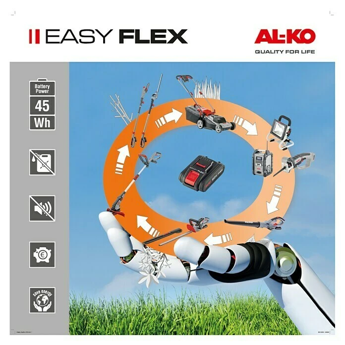 Der AL-KO Easy Flex Ersatz-Akku B 50 Li ist passend für alle EasyFlex-Gartengeräte. Die gespeicherte Gesamtenergie des 20 V/2,5 Ah Li-Ionen-Akkus beträgt 45 Wh. Der leichte und kompakte Akku versorgt die EasyFlex-Gartengeräte mit Energie für Arbeitszeiten von bis zu 45 Min (abhängig von Gerät und Arbeitsbereich sowie äußeren Einflüssen).