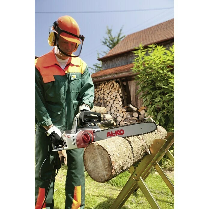 Die Premium Elektro-Kettensäge EKI 2200/40 von AL-KO überzeugt durch ihren kraftvollen 2200W-Elektromotor, der eine hohe Schnittleistung ermöglicht. Sicherheit gewährleistet die Systembremse und der Handschutzbügel mit Kettenschnellstopp. Ausgestattet ist die Kettensäge mit einem hochwertigen OREGON-Schwert mit hochwertiger OREGON-Kette und automatischer Kettenschmierung. Das Kettenspannen kann ganz mühelos ohne Werkzeug erfolgen. Außerdem kann über ein Sichtfenster der Ölstand im Tank mühelos abgelesen werden. Der längs verbaute Motor bringt Vorteile in der Gewichtsverteilung und erleichtert die Arbeit.