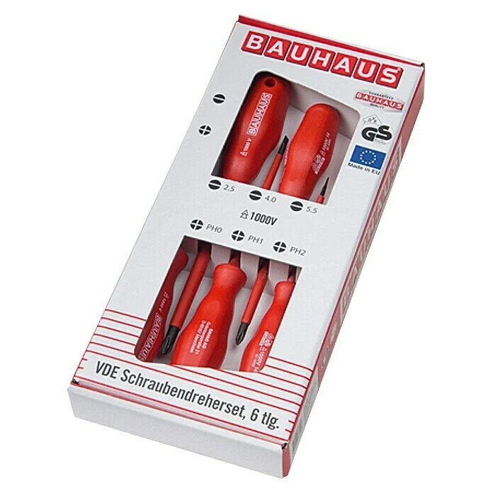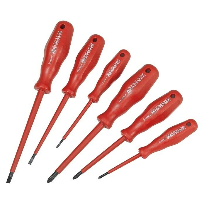 Der VDE-Schraubendrehersatz von BAUHAUS besteht aus 6 isolierten VDE-Schraubendrehern für Schlitz- und Phillips-Kreuzschlitzschrauben. Der ergonomisch geformte und resistente Griff sorgt für schnelles und schonendes Arbeiten. Jeder Schraubendreher ist 100% stückgeprüft, um ein sicheres Arbeiten bis 1.000 V zu gewährleisten. Die Griffkennzeichnung erleichtert ein schnelles Auffinden und Sortieren. Die VDE Schraubendreher verfügen über ein Aufhängeloch und schwarz brünierte Klingenspitzen für erhöhten Korrosionsschutz.