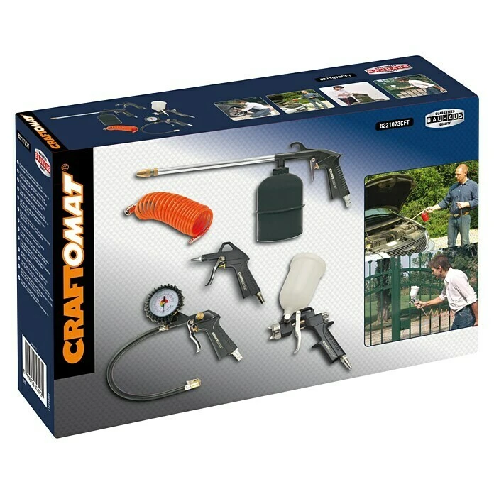 Das Craftomat Druckluftset ist vielseitig in Haushalt, Werkstatt oder im Hobbybereich einsetzbar. Es eignet sich zum schnellen Ausblasen von Ritzen und Hohlräumen, zum mühelosen Reifenfüllen und zum Versprühen von Öl oder Spritzmitten. Aber auch für kleine Lackierarbeiten ist es ideal einsetzbar. Das 5-teilige Set enthält neben Farbspritz-, Sprüh- und Ausblaspistolen zusätzlich einen Spiralschlauch zum Kompressor-Anschluss sowie einen Reifenfüllmesser.