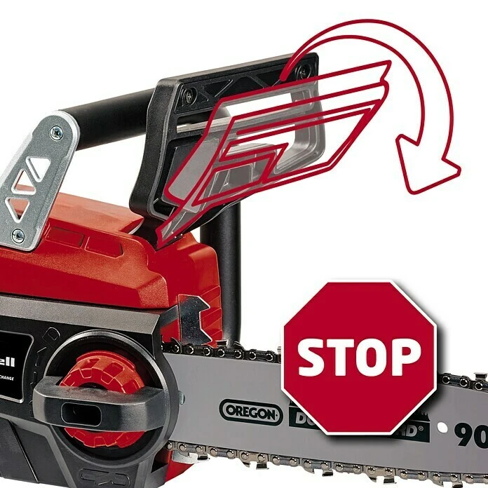 Die Akku-Kettensäge GE-LC 18 Li-Solo von Einhell ist Oregon-Schwert und -Kette ausgestattet. Mit einer Drehzahl von 2.400 Umdrehungen pro Minute und einem Gewicht von 3,6 Kilogramm ist sie allen gängigen Gartenarbeiten gewachsen. Das Schwert hat eine Länge von 250 Millimeter und erreicht eine maximale Schnitttiefe von 230 Millimeter. Kettenspannung und Kettenwechsel lassen sich werkzeuglos vornehmen und erleichtern so den Arbeitsfluss. Der ergonomisch geformte Griff mit Softgrip-Besatz unterstützt ein angenehmes Führen der Säge, während die automatische Kettenschmierung die Kette konstant schützt. Das Schmieröl ist, dank der großen Öffnung, einfach nachzufüllen. Für den Schutz des Benutzers ist die Kettensäge mit Rückschlagschutz, Sofort-Kettenbremse, Motorbremse und Kettenfangbolzen ausgestattet. Der Vordere Handschutz fungiert als Rückschlagschutz und als Sofort-Kettenbremse zugleich. Wird die Kette während des Betriebs zurückgeschlagen, schützt der Handschutz die Finger vor Verletzung stoppt die Kette in 0,1 Sekunde. Die Motorbremse wird aktiv sobald der Schalter den Kontakt verliert und stoppt die Kette um ein Nachlaufen der Kette zu verhindern. Der Kettenfangbolzen verhindert ein Ausschlagen der Kette während des Betriebs nach hinten. Zum möglichst präzisen und sicheren Arbeiten, verfügt die Akku-Kettensäge über einen Krallenanschlag aus Metall. Dieser verhindert ein Ausweichen der Säge beim Ansetzen. Die Säge wird durch einen leistungsstarken Akku betrieben. Das Schnellladegerät lädt den Akku innerhalb einer Stunde voll auf. Die Säge ist Teil der Power X-Change Familie von Einhell. Innerhalb dieser Serie können die Akkus mit allen Geräten kombiniert werden. Die Akku-Füllstandsanzeige wird über 3 LEDs angezeigt.