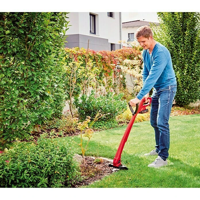 Mit dem Einhell Akku Rasentrimmer GC-CT 18/24 Li P-Solo können grüne Ränder, Grasstreifen und unwegsamen Ecken leicht beseitig werden – kabellos und ohne Bewegungseinschränkungen. Der Akku Rasenschneider ist ein Mitglied der Power X-Change-Familie: die kraftvollen Systemakkus finden bei allen Geräten der Reihe Anwendung. Für den Betrieb ist eine 18 V-Batterie notwendig. Durch den Zusatzhandgriff kann der Akku Rasentrimmer mit Kunststoffmesser bequem mit zwei Händen bedient werden. Bei der Ausführung von Gehäuse und Zusatzgriff wurde auf Langlebigkeit Wert gelegt, sie sind aus schlagzähem, hochwertigem Kunststoff gefertigt. Mit bis zu 8.500 Umdrehungen pro Minute arbeitet der Akku Kantenschneider kraftvoll auf einer Schnittbreite von bis zu 24 Zentimetern. Zum Lieferumfang gehören 20 Stück Kunststoffmesser. System-Akku und Ladegerät sind separat erhältlich.
