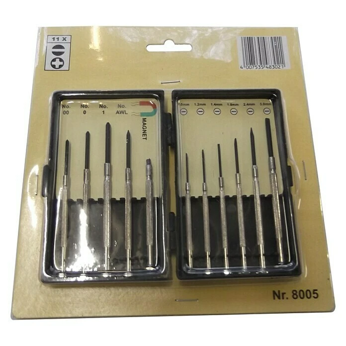 Der Feinmechaniker-Schraubendrehersatz enthält 11 Werkzeuge, die in keiner Werkstatt und in keinem Haushalt fehlen sollten. Die kleinen Schraubendreher ermöglichen Reparaturen an filigranem Schmuck wie Uhren oder Ketten, aber auch an keinen Geräten wie Weckern, Fernbedienungen oder Computerbauteilen. Die Schraubendreher sind in einer praktischen Box untergebracht, die für eine übersichtliche Ordnung sorgt und einen verlustfreien Transport ermöglicht. Um eine gute Lebensdauer zu erreichen sind die Griffe sowie die Klingen aus Werkzeugstahl gefertigt.