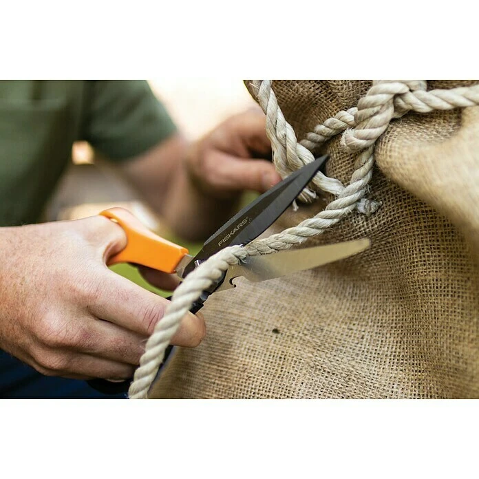 Schneiden Sie mit der vielseitig einsetzbaren Fiskars Cuts + More Mehrzweckschere eine Vielzahl von schweren Gartenmaterialien auf, wie z. B. Düngersäcke, Gartenvlies, Sichtschutz und vieles mehr. Vom Schneiden der Beeteinfassung bis zum Aufbringen von Mulch ist die Vorbereitung und Pflege eines starken Fundaments der Schlüssel zu einem gesunden Garten und kann eine Vielzahl von mühsamen Aufgaben beinhalten ″“ die alle von der Erhaltung der Klingenschärfe abhängen. Dieses vielseitige Werkzeug verfügt über ergonomisch geformte Griffe und vollständig gehärtete, präzisionsgeschliffene Stahlklingen, die bis in die Spitze schneiden und länger scharf bleiben. Zu den weiteren Merkmalen gehören eine Power-Kerbe zum Schneiden von leichten Seilen, Draht- und Bindfadenschneider, eine spitze Ahle zum Durchstoßen kleiner Löcher in Pappe und Leder sowie ein Flaschenöffner. Die Schere kann auch auseinandergenommen werden, so dass Sie ein titanverstärktes Messer zum Schneiden großer Objekte erhalten. Die Schutzhülle für sicheres Transportieren und Aufbewahren enthält einen integrierten Klebebandschneider und einen Keramik-Scherenschärfer.