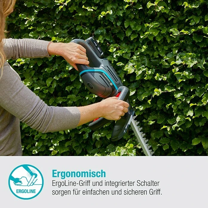 Kabellos, leicht, sicher und benutzerfreundlich: Die Gardena Akku-Heckenschere ComfortCut 50/18V P4A ist zum Schneiden mittelgroßer Hecken einfach perfekt. Die ComfortCut wiegt wenig und ist leicht zu bedienen. Eine LED-Anzeige direkt am Gerät informiert über den Ladestand des Akkus. Der umlaufende ErgoLine-Handgriff mit integrierter Starttaste liegt in jeder Position gut in der Hand. Die Messer sind 50 Zentimeter lang und haben eine optimale Messergeometrie, sodass der Schnitt immer präzise ausfällt. Setzt man die ComfortCut 50/18V P4A nahe am Boden oder entlang von Mauern ein, gewährleistet der Anschlagschutz am Messerende, dass die Klingen nicht beschädigt werden. Die Heckenschere wird ohne Ladegerät und Akkus geliefert. Kompatibel ist das 18V-Akku-System mit der POWER FOR ALL ALLIANCE, einer der größten markenübergreifenden Akku-Allianzen führender Hersteller. Je nach gewähltem Akku-Typ reicht die Laufzeit für bis zu 135 Minuten bzw. 450 Quadratmeter. Die Akkus können für zahlreiche Geräte rund ums Haus und den Garten genutzt werden. So spart man Geld und ist flexibel. Wer das Gerät mit Akku und Ladegerät kaufen möchte, für den ist das Ready-To-Use Set das richtige.
