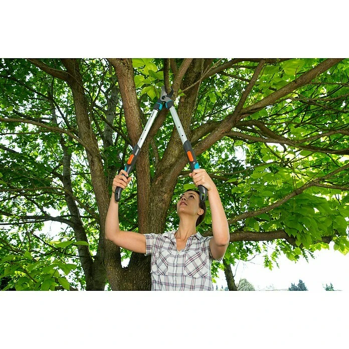 Die TeleCut 520-670 B von Gardena ist die Astschere mit praktischer Teleskopfunktion zum Verlängern der Hebelarme. Jederzeit lassen sich die Hebelarme mit Hilfe der Teleskopauslösung in der Nähe des Griffbereiches um 15 Zentimeter verlängern. Diese nützliche Funktion verleiht während der Baum- und Strauchpflege mehr Flexibilität, weil weiter entfernte Äste erreicht und genauso effektiv geschnitten werden können. Durch den Einsatz leichter Materialien wie Aluminium und die optimale Geometrie der Hebelarme ist die Teleskopastschere mit 1 Kilogramm Gewicht unglaublich leicht, was ermüdungsfreies Arbeiten ermöglicht. Beim Schneiden werden Stöße mit Hilfe des eingebauten Anschlagspuffers aus Spezialkunststoff abgefedert und damit die Handgelenke geschont. Die Handhabung der TeleCut ist dank der ergonomischen ErgoTec-Griffe überaus komfortabel und die Weichkomponenten verhindern ein Abrutschen der Hände, sodass die Schere immer fest in den Händen liegt. Durch das Bypass-Schneidprinzip gleiten die beiden präzisionsgeschliffenen Klingen beim Schneiden aneinander vorbei und erzielen so einen präzisen und sauberen Schnitt am frischen Holz. Die Antihaftbeschichtung der Schneidwerkzeuge erleichtert durch das Verringern von Reibung den Schnitt, schützt vor Rost und auch Pflanzensäfte bleiben nicht an den Klingen kleben. Die hohe Qualität der TeleCut 520-670 B ist Made in Germany und Gardena gewährleistet eine lange Herstellergarantie von 25 Jahren.