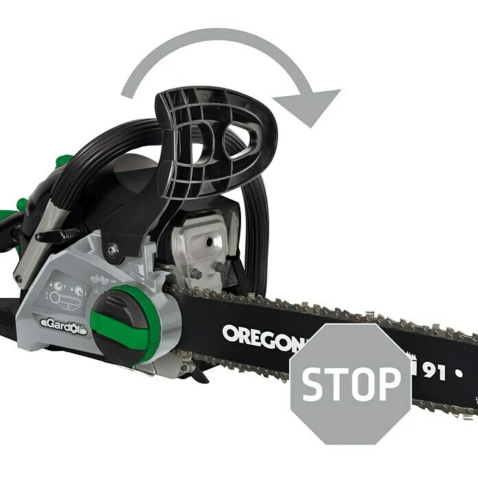 Die Benzin-Kettensäge GMS-E-40EV von Gardol mit einer Leistung von 1,4 kW (entspricht ca. 1,82 PS) und einer Schwertlänge von 40 cm ist ein handliches und leistungsstarkes Gerät zum Sägen von Brennholz, zum Auslichten und zum Fällen und Entasten. Die Kettensäge ist mit einem Antivibrationssystem ausgestattet, welches Stöße abdämpft, sodass ein ermüdungsfreies Arbeiten möglich ist. Primer und Auto-Choke sorgen als Kaltstarthilfen für einen einfachen Start des Geräts. Die digitale Zündung gewährleistet eine schnelle und dynamische Gasannahme und garantiert einen stabilen Motorlauf. Die Kettensäge ist mit OREGON Qualitätsschwert und – kette ausgestattet. Die Kette lässt sich werkezuglos spannen und wechseln.