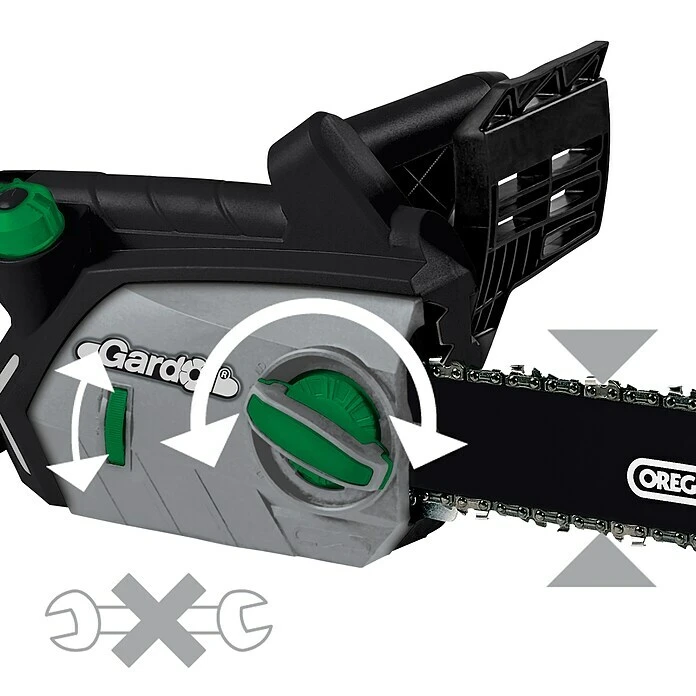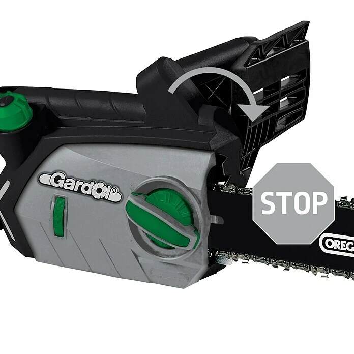 Die Elektro-Kettensäge GEK-E 2240 inkl. Ersatzkette von Gardol überzeugt durch ihren kraftvollen Elektromotor, der eine hohe Schnittleistung ermöglicht. Die GEK-E 2240 ist mit Softstart, einem Metallgetriebe sowie einem Krallenanschlag aus Metall ausgestattet. Das Kettenspannen kann ganz mühelos ohne Werkzeug erfolgen. Die automatische Kettenschmierung sorgt für eine einfache Wartung. Dank der im Lieferumfang enthaltenen Ersatzkette erhalten Sie ein optimales Komplettpaket.