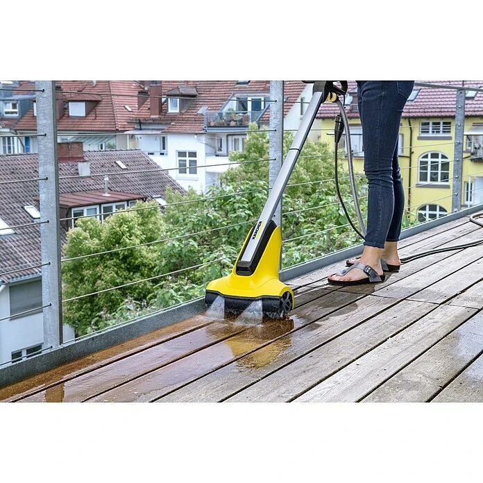 Mit dem elektrisch betriebenen PCL 4 lassen sich verschiedene Außenflächen einfach, gründlich und besonders gleichmäßig von hartnäckigen Verschmutzungen befreien. Den Terrassenreiniger kurzerhand an den Gartenschlauch anschließen und losreinigen. Dank der Kombination aus 2 rückwärts rotierenden und austauschbaren Bürstenwalzen und der regulierbaren Wassermenge kann der Schmutz zuverlässig gelöst und gleichzeitig abtransportiert werden. So wird die Terrasse in Nullkommanix gründlich sauber – und es wird nur so viel Wasser verbraucht, wie die Reinigungsaufgabe erfordert. Die Breite und Position der Walzen sind so ausgelegt, dass 2 Dielen in einem Schritt und bis an die Kante gereinigt werden können, was zusätzlich Zeit spart. Dank der einfach zu wechselnden Bürstenwalzen lassen sich neben Holz und WPC auch sämtliche Steinflächen rund ums Haus gründlich und sanft reinigen. (Optionales Zubehör: Bürstenwalze für Stein) Der PCL 4 wurde ergonomisch so gestaltet, dass auch bei unterschiedlichen Körpergrössen immer eine aufrechte Arbeitshaltung möglich ist.