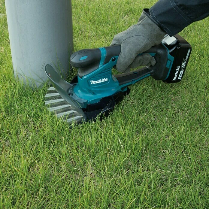 Die Makita Akku-Grasschere kann durch alle Akkus der 18 V Serie von Makita mit Energie versorgt werden. Durch das austauschbare Messer verweint das praktische Gerät zwei hilfreiche Werkzeuge in einem Gerät. Die Grasschere ermöglicht das exakte Schneiden von Rasenkanten, während die Strauchschere das Stutzen von kleinen Büschen und Sträuchern erlaubt. Beide Messereinsätze können mit nur wenigen Handgriffen ausgetauscht werden, sodass eine möglichst hohe Flexibilität geboten ist.
