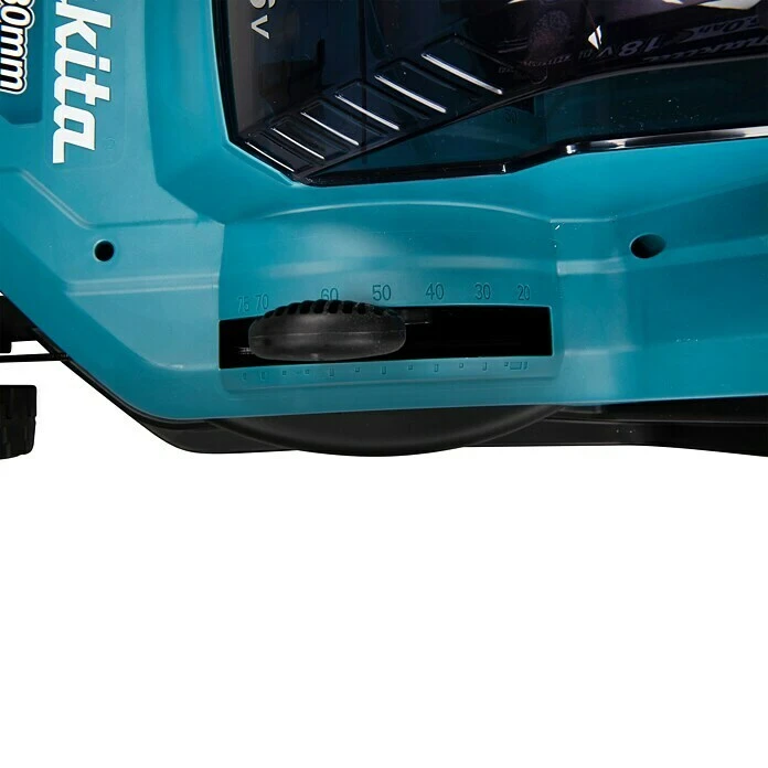 Der Makita Akku-Rasenmäher 2 x 18 V DLM432PT2 zeichnet sich aus durch eine geräuscharme, leichte Bedienbarkeit. Er ist mit seiner Schnittbreite von 43 cm sowie seiner Füllstandsanzeige im 50 Liter Grasfangkorb ideal für kleine bis mittlere Rasenflächen geeignet. Zwei in Reihe geschaltete 18 V Akkus werden parallel in separate Akkuhalterungen eingeschoben. Praktischerweise verfügt er über ein kompaktes Staumaß durch seinen faltbaren sowie höhenverstellbaren Holm. Auch randnahes Mähen wird ermöglicht durch nach innen versetzte Räder. Dank seiner speziell geformten Front ist merklich weniger Kraftaufwand beim Schieben notwendig. Die doppelte Batterieladestandanzeige befindet sich im direktem Sichtfeld des Anwenders. Der Rasenmäher bietet optimalen Schutz gegen Staub und Spritzwasser auch unter harten Bedingungen.
