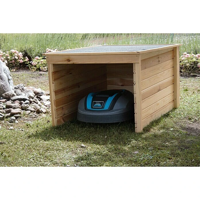 Die Mähroboter-Garage von Promadino bietet Ihrem Mähroboter ein witterungssicheres Zuhause. Die Mähroboter-Garage besteht aus naturbelassenem Kiefernholz. Das Dach ist eingedeckt mit Dachpappe, dadurch wird die Garage optimal vor Sonne und Regen geschützt. Ein einfacher Selbstaufbau ist dank der vormontierten Elemente möglich.