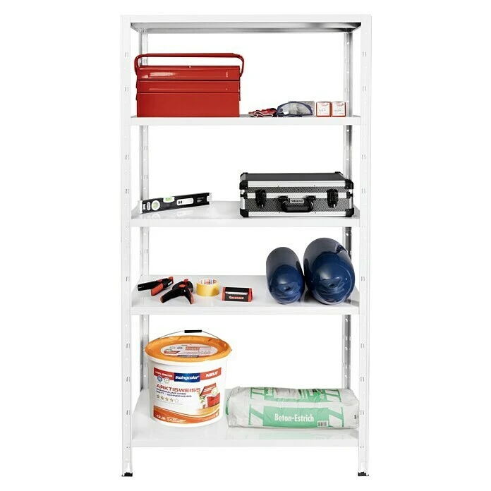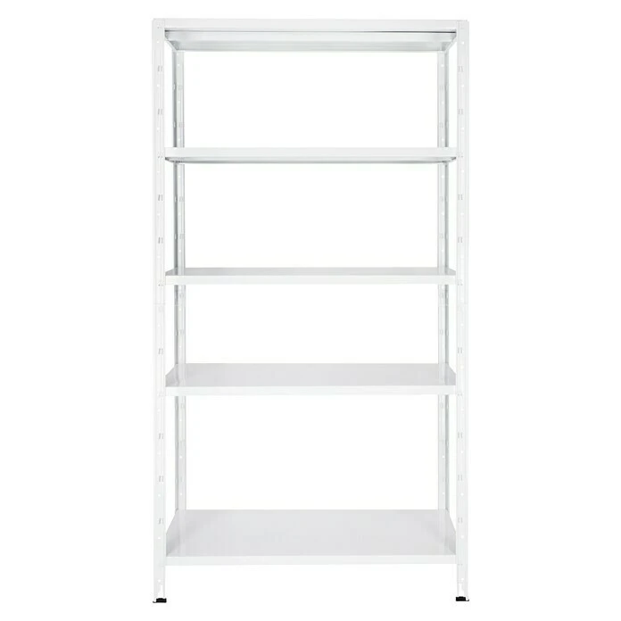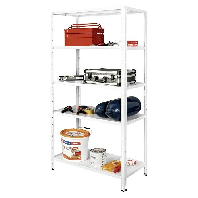 Das Regalux Steckregal bietet Stauraum auf fünf Böden mit einer jeweiligen Traglast von 65 kg. Der Aufbau ist dank des Stecksystems einfach und problemlos. Durch die weiß lackierte Oberfläche ist das Regal vor Rost geschützt. Das Befestigen an einer Wandfläche ist mit Hilfe des mitgelieferten Montagematerials optional möglich und sorgt für zusätzliche Stabilität.