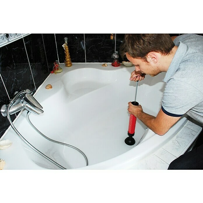 Die Rothenberger Abflusspumpe ROPUMP ist ein kraftvoller Saug-Druckreiniger zu lösen von Verstopfungen in Waschbecken, Abflüssen, Badewannen und Duschen. Durch den robusten Stempel kann die Luft kraftvoll in das Rohrsystem eingepresst werden. Für ein gutes Ergebnis sollte die verstopfte Leitung mit Wasser gefüllt werden, da dadurch ein höherer Druck aufgebaut werden kann. Der große Vorteil beim ROPUMP Abflussreiniger ist, dass er völlig ohne Chemie auskommt und die Umwelt nicht durch schädliche Stoffe belastet wird. Durch das Kugelgelenk zwischen Pumpe und Adapter wird eine hohe Flexibilität erreicht, die für eine bessere Abdichtung des Gummiadapters sorgt.