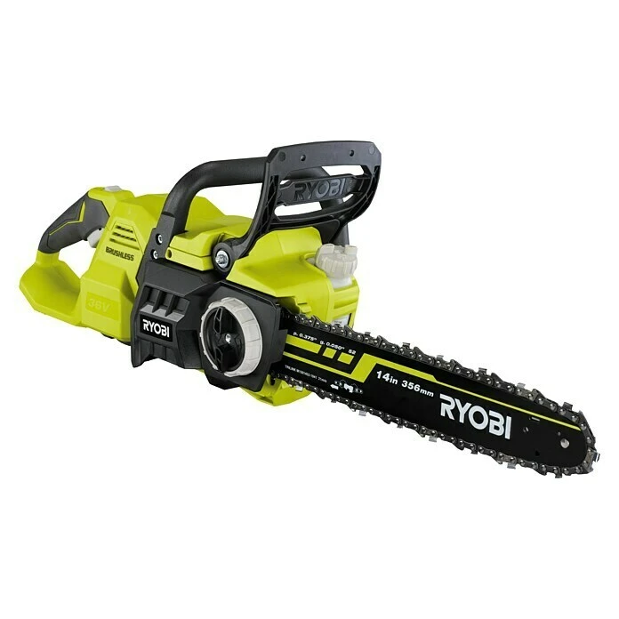 Die Ryobi Akku-Kettensäge wird von einem leistungsstarken 36 V Akku betrieben und überzeugt mit einer optimalen Leistung, Laufzeit und Sicherheit. Die Akkukapazität von 5 Ah sorgt für eine lange Arbeitsdauer des bürstenlosen Motors. Durch die werkzeuglose Kettenspanneinrichtung und die automatische Kettenschmierung wird eine bequeme Handhabung ermöglicht. Zum bequemen Arbeiten in allen Positionen verfügt die Kettensäge über einen umlaufenden Zweithandgriff. Des Weiteren sind die Griffflächen für einen sicheren Halt und eine geringe Vibration gummiert. Für die nötige Sicherheit sorgt eine schnelle Kettenbremse mit einem Stopp in unter 0,12 Sekunden und ein Sicherheitsschalter mit Einschaltsperre. Der Öltank ist zur erleichterten Füllstandkontrolle transparent.