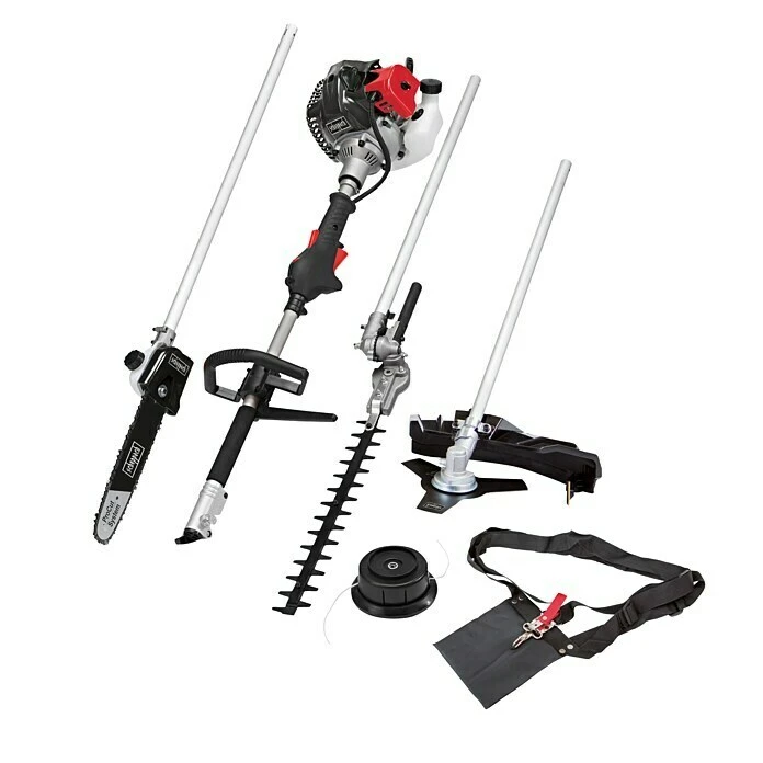 Das Scheppach Multifunktionsgerät 4 in 1 kann mit nur einem Handgriff vom Rasentrimmer zur Motorsense, Heckenschere oder zum Hochentaster umgebaut werden. Im Handumdrehen erledigen Sie so Gartenarbeiten wie Rasenpflege, Heckenpflege und Baumpflege. Der leistungsstarke 32,6 cm 3 2-Takt-Motor bietet ein hohes Maß an Kraft für alle Aufgaben im heimischen Garten. Gleichzeitig sorgt die vibrationsgedämpfte Bauweise für ein angenehmes Arbeiten. – Hochentaster: 10″ Scheppach Schwert/-Kette; Schnittlänge 254 mm; automatische Kettenschmierung; Arbeitshöhe: 300 – 350 cm (je nach Körpergröße) – Rasentrimmer: Doppelfadenspule; 430 mm Schnittbreite – Heckenschere: max. 24 mm Schnittstärke; 406 mm Schwertbreite; schwenkbar um 165° in 15° Schritten – Motorsense: 255 mm Schnittbreite und langlebige Metall-Klinge. Diese Ausführung kommt mit einem 10″ Scheppach Schwert und einem Schultergurt.