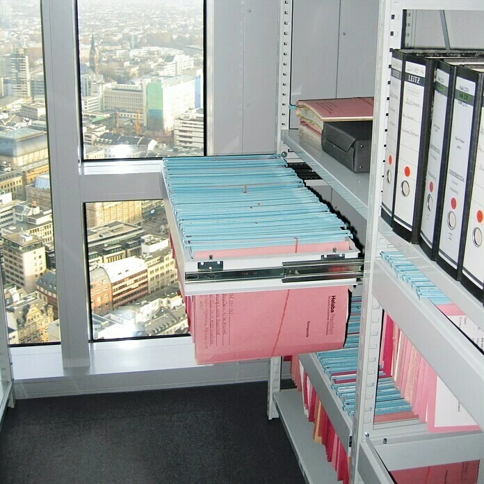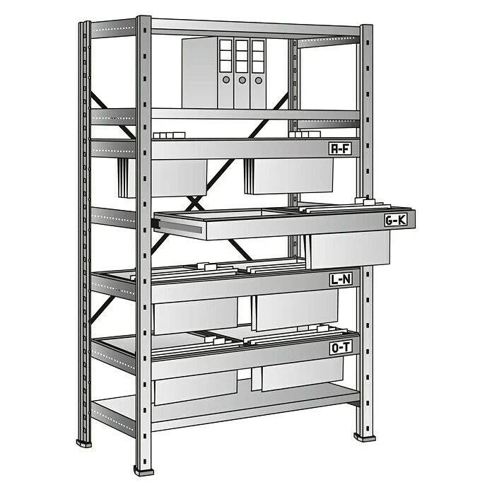 Das Hängeregistratur Grundregal von Scholz eignet sich zum ordentlichen Verstauen und Archivieren von Akten in Büros oder Praxen. Auf 3 Böden mit einer jeweiligen Traglast von 200 kg und 4 Hängerahmenböden mit je 100 kg Traglast steht Ihnen Stauraum für Ordner und Akten zur Verfügung. Die Hängerahmen lassen sich einseitig für eine einfachere Nutzung vertikal über einen Teleskopauszug ausziehen. Die hochwertige Verarbeitung aus lackiertem Stahlblech sorgt für eine lange Lebensdauer und die nötige Sicherheit wird durch die hohe Stabilität gewährleistet. Gleichzeitig ist es, dank des praktischen Stecksystems, schnell und einfach, ganz ohne Werkzeug, montiert. Das Regal lässt sich bei Bedarf durch Anbaufelder beliebig erweitern und sorgt somit für größtmögliche Flexibilität.