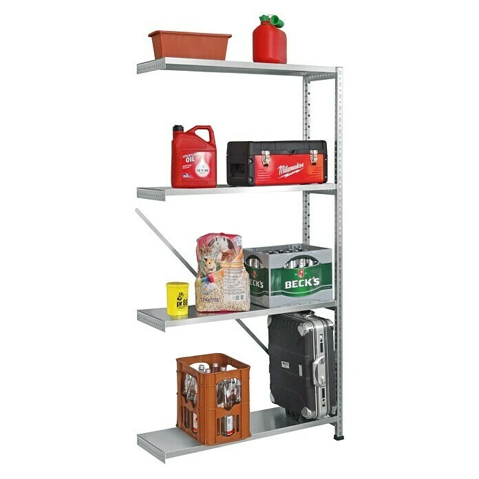 Das System Komplettregal von Scholz ist ein Anbaufeld und nur in Verbindung mit dem Grundfeld montierbar. Es eignet sich zum Lagern von unterschiedlichem Lagergut für Keller, Garagen und Werkstatt und ist Teil eines umfangreichen Regalsystems welches ideal für all jene geeignet ist, die ein flexibles Regalsystem benötigen das sich vielseitig und leicht in die vorhandenen Räumlichkeiten einpassen und erweitern lässt. Der Aufbau ist dank des Stecksystems einfach und problemlos durchzuführen. Das Regal verfügt über 4 Fachböden mit einer jeweiligen Traglast von 100 kg sowie über abgerundete Kanten und Ecken was der Gefahr von Verletzungen vorbeugt. Durch die verzinkte Oberfläche ist es vor Rost und Witterungseinflüssen geschützt. Das Anbaufeld lässt sich bei Bedarf durch weitere Anbaufelder beliebig erweitern. Die umfangreiche Auswahl dieses Systems an Regalen, Grundelementen, Anbauelementen und Zubehör entnehmen Sie bitte der angehängten Produktübersicht.
