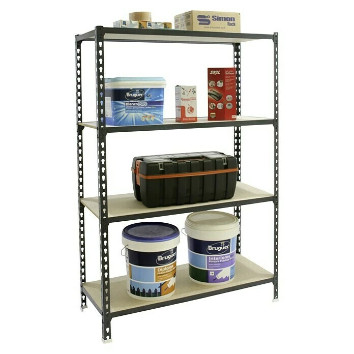 Das Metallregal Maderclick von Simon Rack ist mit einer Traglast von 150 kg pro Boden das ideale Regal für Keller, Garage und Werkstatt. Ausgestattet mit höhenverstellbaren Fachböden bietet es viel Stauraum und die starre Konstruktion sorgt für eine hohe Stabilität und Standsicherheit. Dank des praktischen Stecksystems lässt es sich schnell und einfach montieren. Somit bietet das Metallregal professionellen Stauraum auf hohem Niveau.
