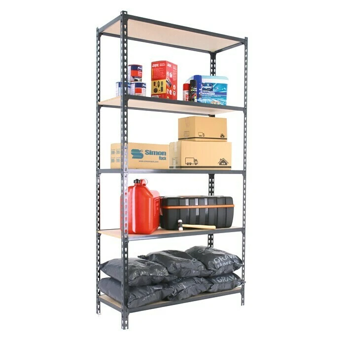 Das Metallregal Maderclick Plus von Simon Rack ist mit einer Traglast von 150 kg pro Boden das ideale Regal für Keller, Garage und Werkstatt. Ausgestattet mit insgesamt 5 Fachböden bietet es viel Stauraum und die starre Konstruktion sorgt für eine hohe Stabilität und Standsicherheit. Somit ist eine separate Verankerung in der Wand nicht notwendig. Dank des praktischen Stecksystems lässt es sich schnell und einfach ohne Werkzeug montieren. Somit bietet das Metallregal professionellen Stauraum auf hohem Niveau.