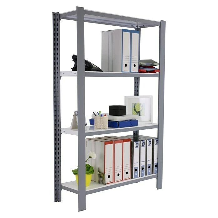 Das Schwerlastregal Officlick von Simon Rack ist mit einer Traglast von 200 kg pro Boden das ideale Regal für Büros oder Praxen. Ausgestattet mit insgesamt 4 Fachböden bietet es viel Stauraum und die starre Konstruktion sorgt für eine hohe Stabilität und Standsicherheit. Somit ist eine separate Verankerung in der Wand nicht notwendig. Gleichzeitig lässt sich das Regal mit einer optional erhältlichen Regalerweiterung beliebig erweitern. Dank des praktischen Stecksystems lässt es sich schnell und einfach ohne Werkzeug montieren. Somit bietet das Metallregal professionellen Stauraum auf hohem Niveau.