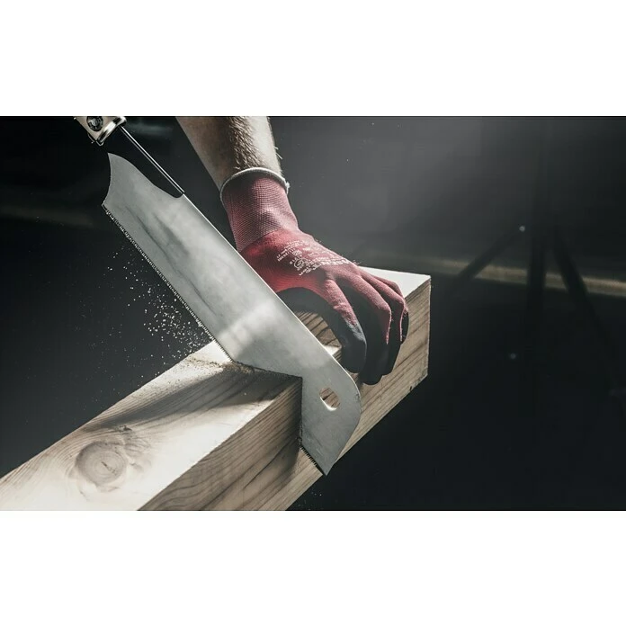 Die Wisent Japansäge Kataba ist mit einer feinen Spezialzahnung ausgestattet. Das Blatt ist flexibel und eignet sich sehr gut für feine Schnitte an Ecken und Kanten. Der lange traditionelle Bambusgriff liegt gut in der Hand. Kataba steht für den dreiseitigen Spezialschliff und ein flexibles Sägeblatt mit extra langem Bambusgriff. Durch die Zahnung und den Schliff lassen sich viele Holzarten sehr präzise und mit geringstem Ausreißen sägen, hierbei erfolgt der Schnitt nur auf Zug wodurch die Führung noch verbessert wird. Eine Zahnschutzschiene schützt die Zahnung vor äußeren Umwelteinflüssen und Verletzungen.