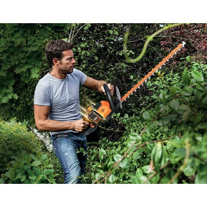 Die Worx 40 V Akku-Heckenschere WG284E.9 ist sorgt für ein leichtes und kabelloses Arbeiten. Ausgestattet mit einem 60 cm langem lasergeschnittenem Diamantmesser und Dual-Schnittklingen ermöglicht sie präzise und gleichmäßige Schnitte. Der Zweihand-Sicherheitsschalter verhindert ein unabsichtliches Starten. Der Zusatzhandgriff sorgt für eine erhöhte Sicherheit durch bessere Kontrolle – für müheloses Arbeiten in jeder Position. Die Heckenschere wird durch zwei 20 V Li-Ionen Akkus angetrieben, welche nicht im Lieferumfang enthalten sind. Die 20 V Akkus sind mit allen 20 V und 2 x 20 V Worx Garten- und Elektrowerkzeugen kompatibel.